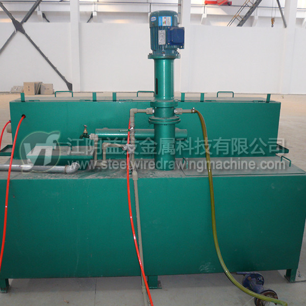 箱體采用Q235板焊接而成,內(nèi)膽采用314不銹鋼板焊接防止硼砂水受銹蝕的污染,保持硼砂的純潔度,保持鋼絲涂硼效果。兩層之間有40mm的保溫棉。不銹鋼電加熱管12KW,有熱電偶控制溫度,1.5KW的提升泵用于硼砂水上下循環(huán),相當(dāng)于自動攪拌,箱體上層液體采用了多次溢流方式,出口處高壓氣吹用于調(diào)節(jié)鋼絲表面的硼砂量。長度2500MM,寬度500mm,高度1100mm,重量800Kg。